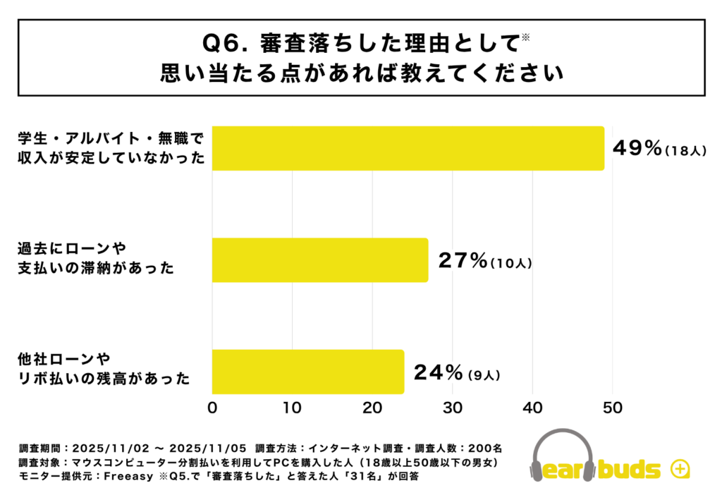 学生・アルバイト・無職で収入が安定していなかった 48%(15人)/過去にローンや支払いの滞納があった 32%(10人)/他社ローンやリボ払いの残高があった 24%(10人)