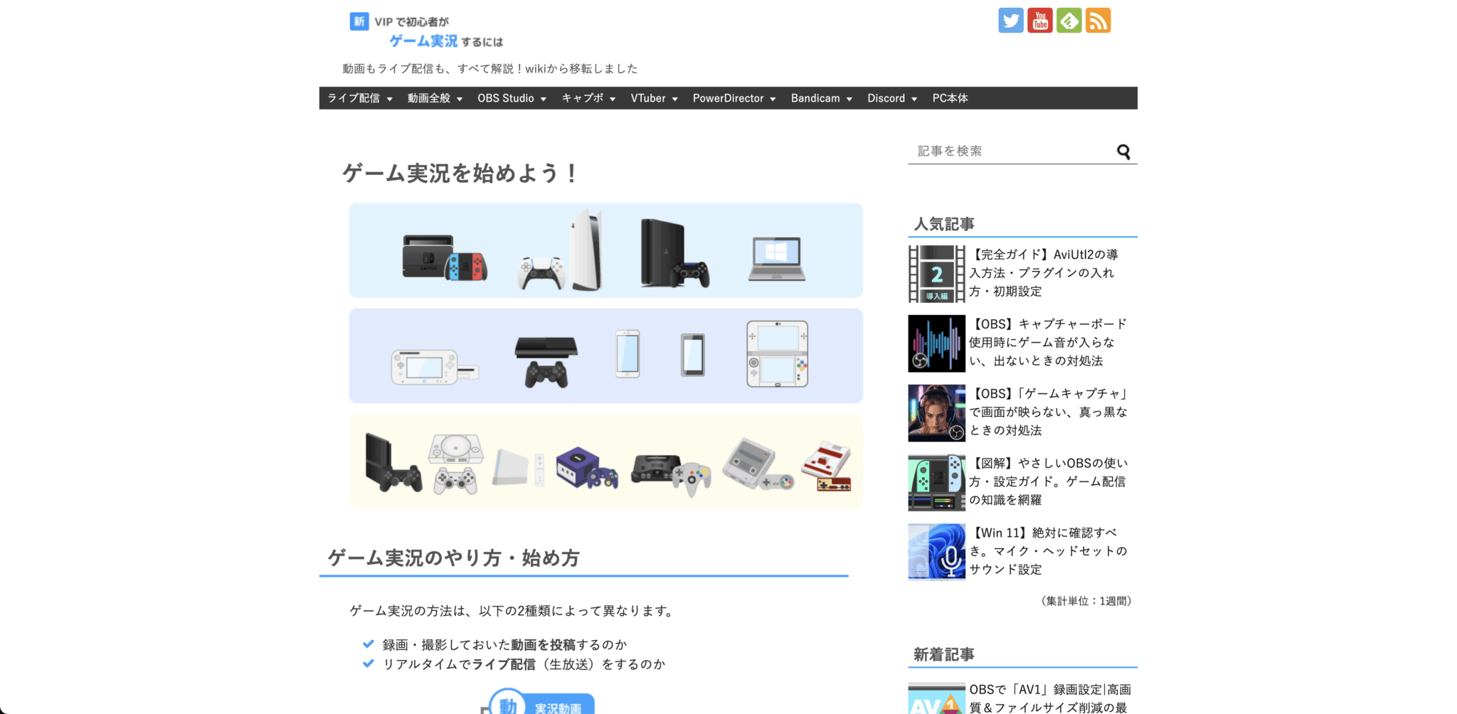 「新・VIPで初心者がゲーム実況するには」では、ゲーム実況や配信を行うでの具体的なやり方をはじめ、必要な道具から設定までをわかりやすくまとめているサイトです。
